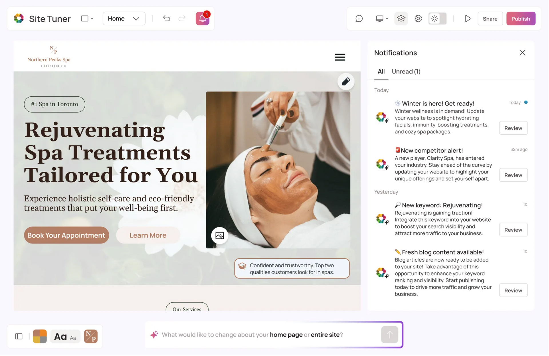During the summer, the platform tailors the site to highlight services like hydrating facials and cooling body wraps, ensuring visibility in searches for terms like "summer skin care" and "refreshing facials." As winter arrives, the AI shifts the focus to skin recovery treatments and moisturizing facials, making sure the spa stays top of mind during the colder months.